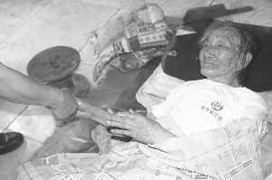 守候在旁的是她的小女儿李小菊和她刚冰释前嫌的次子李明。老太太由于年龄和疾病的缘故,生活已经不能自理,但头脑还清楚,见我们来了,心情很好,坚持要坐起来,她的儿子把她扶起,拿枕头紧紧地压在她的身后,支撑着她的后背。老太太颤颤巍巍地坐了起来,头上稀疏的白发有些凌乱,岁月的痕迹深刻地烙在脸上,许是长期卧床体弱乏力的缘故,嘴不停地轻微抽动着,儿子李明紧紧地扶着她的肩头。