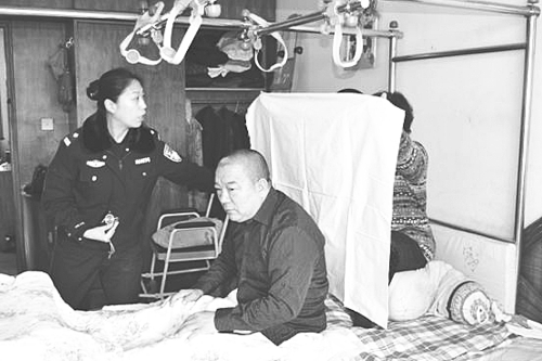 11月24日,王女士来到鹿泉公安局获鹿分局户籍室,反映丈夫赵先生因突发急性脊髓炎导致下身瘫痪,无法办理二代身份证。户籍民警了解情况后,主动上门为老人提供服务。图为民警李华帮助瘫痪在床的赵先生摆好最佳姿势采像。 郄世民 摄