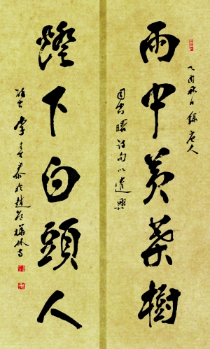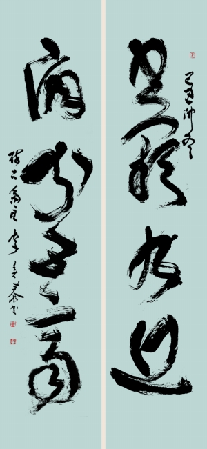 翻开《李喜泰书法艺术》作品集,一幅南宫碑字体的“春风诗友联”直扑眼前,外方处的刚劲,内圆里的含蓄,印证着南宫碑阴阳相应,汇于中和的艺术魅力。笔笔中锋,灭迹阴端,不见起止之迹,给人以“藏锋以含其气,无锋以含其味”的感受。内张外矩,浑然而成,仿佛太极推手,力聚于内,劲含于中,蓄而待发,力抗千鼎。一页页再翻下去,苏轼的快意纯粹、汉简的古意大成、何绍基的空灵动荡,杨维桢的恣意张扬、黄庭坚的疾风骤雨……果然递次尽显。而侧、中、破锋,浓、淡、干、温墨像皆随性而绰其态,审视而扬其性。“空潭泻春,古镜照神”。就如李喜泰自己所说的,书法的现象无处不在,它是一种运动,是作用于纸面上的运动,不仅是文字的运动,也是心灵的运动。在一幅幅条幅面前,在一册册手札里面,你可以阅读到李喜泰的心灵。