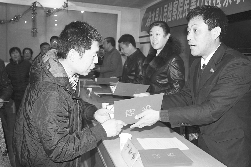 徐水县检察院日前聘请了19名律师作为民事行政检察工作司法联络员,旨在通过联络和沟通及时发现基层矛盾纠纷,畅通群众诉讼渠道,依法保护弱势群体的合法权益,及时帮助群众解决实际困难。图为受徐水县检察院党组书记、检察长滕秋安委托,该院党组成员、副检察长于新峰(右一)在向受聘的司法联络员颁发聘书。 崔玉田 张盛 摄影报道
