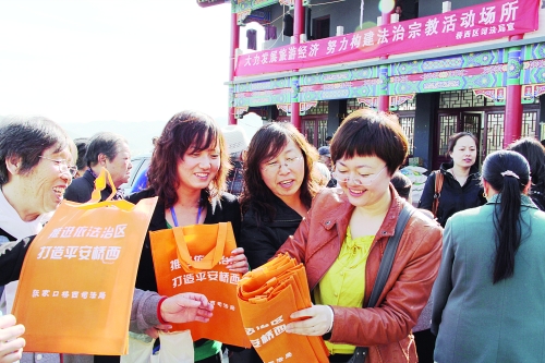 “六五”普法过程中,“法律进景区”成为张市普法工作新亮点。图为普法宣传员在大境门景区向游客发放宣传材料。 乔希宣 摄