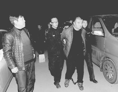 王某刚从银行取出的20多万元现金,不到十分钟,竟然在自己的轿车上被盗了。青龙满族自治县警方经过一个月的艰苦侦查,最终锁定犯罪嫌疑人,并远赴千里外的东北吉林,将犯罪嫌疑人抓获。据警方提供的监控录像显示,这几名窃贼先是用钉子扎了车胎,待王某忙着修理车的工夫,下手施窃。图为11月23日夜里民警将嫌犯押解回来的情形。 戴燕山 摄