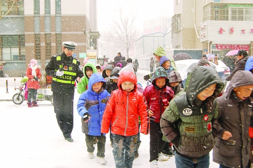 12月17日,一场纷纷扬扬的冬雪将唐山丰南点缀得银装素裹。风雪交加的大街上,依然会看到民警忙碌的身影。他们时而从容地指挥车流,时而引导过往学生、群众安全通行,时而搀扶摔倒的路人,时而闻警而动化解纠纷。图为执勤交警护送放学的小学生过马路。
