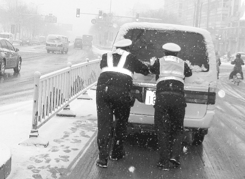 12月17日早晨,廊坊市区降下入冬后的第一场大雪。漫天雪花飘舞,路面积雪湿滑,市公安交警二大队迅即启动雪天应急处置预案,大队领导靠前指挥,增加交通流量密集路口管控力量,民警通过开启警灯、大声喊话、手势指挥和带道压速等,引导行人和车辆安全有序通行。截至下午雪停,该大队辖区未发生一起长时间、大范围交通拥堵及重特大道路交通事故。图为民警雪中帮助推行故障车辆。