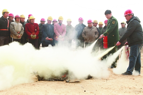 为确保建设工程施工现场消防安全,12月19日,永年县公安消防大队开展“消防安全进工地”活动,组织消防官兵深入辖区工地,向农民工讲解灭火器的使用方法、火场逃生技能、救援疏散等安全常识,并面对面宣传消防安全法律法规。图为消防官兵正组织农民工进行灭火器使用演练。 胡高雷 摄