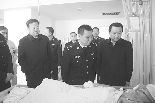 近日,邯郸市副市长、公安局局长艾文庆等人来到邯郸市中心医院,慰问因公受重伤的武安市交警大队民警郝广荣。在重症病房内,艾文庆鼓励他一定要坚强,早日康复。随后,艾文庆又看望了伤者的家人,并送去慰问金。 郭增祥 摄
