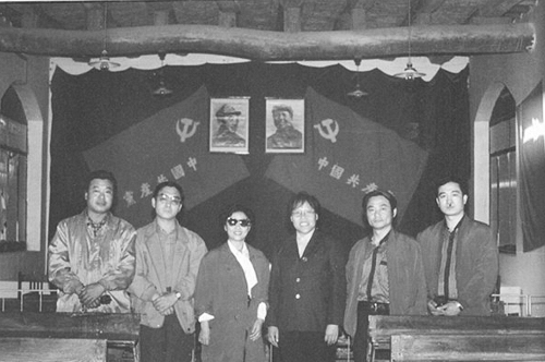 1993年12月26日,此歌词作为石家庄市举办的“纪念毛泽东诞辰100周年大型文艺晚会”的主题歌,由当时的石家庄市歌舞团张兴国提出创意,李世璋作曲,李瑛主唱。图为歌词作者(左二)与晚会主创人员在西柏坡党的七届二中全会旧址采访时留影。