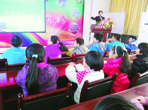 为进一步增强学生的安全意识和法治观念,让他们学会自我保护,做知法、守法的合格小公民,石家庄市草场街小学开展了“做守法护法小公民”主题教育活动。图为一名老师为学生们讲解交通安全知识。