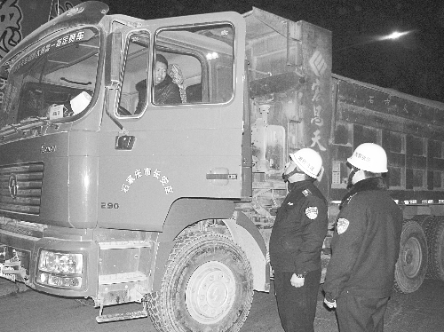 石家庄市委、市政府“铁腕”治理大气环境,但是仍有少量工地和违规渣土运输车不顾大众利益,违规运输渣土,沿途遗撒,污染空气和环境。对此,石家庄市城管部门近日加大对违法施工工地及渣土运输单位的查处力度,实行顶格处罚。图为城管执法人员夜间查处沿街遗撒的渣土车。 付慧 摄
