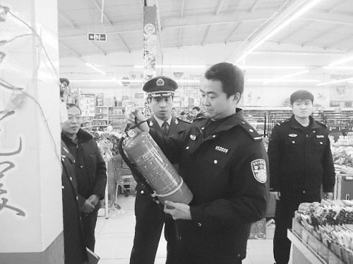 在春节到来之前, 武强县公安局组织民警深入辖区公共场所,展开消防安全检查,进一步提升公共场所的消防安全管理水平和火患自查自纠能力。图为民警在超市检查消防器材。