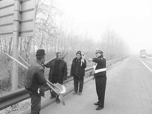 2013年12月29日16时许,高速交警新乐大队民警巡逻时,发现3名男子扛着镐和铁锹,在高速路上行走。经询问得知,3名男子均系附近正定县村民,到农田挖沟干活,为抄近路回家,遂上了高速,且表示不知道在高速上行走属于违法行为。民警耐心教育后将3人及时劝下高速公路。