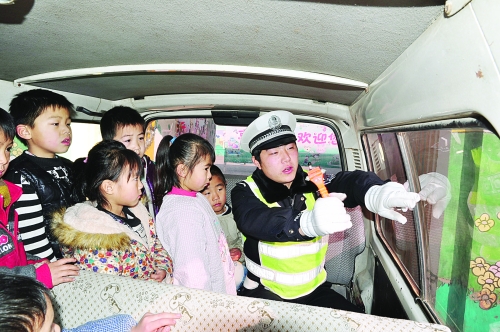寒假将至,为了提高中小学生寒假期间的道路交通安全意识,确保中小学生假期安全,保定市交警六大队组织民警深入辖区中小学校、幼儿园,开展寒假交通安全教育活动。图为民警在辖区南奇乡中心幼儿园为孩子们讲解乘车遇到险情时如何使用救生锤。