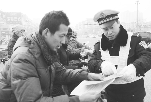 1月10日,沧州市公安局部署各警种在全市主要街道、路口、车站等行人密集的地方设立咨询宣传台,为广大民众提供有关安全方面的咨询服务。图为沧州交警正在对行人进行交通安全宣传。 孔大龙 夏延民 摄