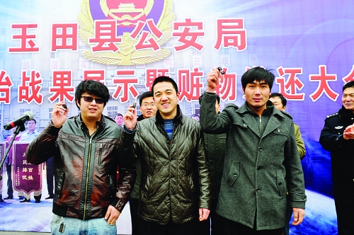 1月17日,玉田县公安局举办了严打整治成果展示及追缴物品发还大会,将查获追缴的200余万元被盗抢钱物发还到群众手中,包括23万元赎金、10辆汽车及古董、摩托车、电动车、电缆等。图为失主高兴地举起被追回汽车的钥匙。