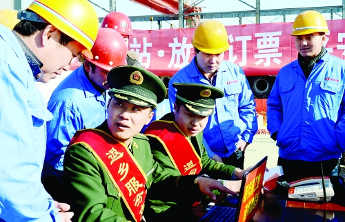 近日,唐山市高尚堡边防派出所针对辖区外来务工人员多的情况,专门抽调民警成立外来务工人员春节订票服务站,帮助辖区内的外来务工人员订购节日车票。图为该所民警在网上为外来务工人员订购车票。