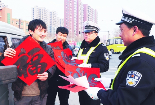 春节临近,沧州市公安交警二大队在整治交通秩序保道路安全畅通的同时,开展了“百福送平安”活动,大队民警亲手书写了百余个大红“福”字,送给有轻微交通违法的客货运驾驶人,提醒他们要自觉遵守交通法规,文明礼让,保障出行安全。图为1月24日上午,在沧州市区三里庄路口,两名面包车驾驶人因无通行证被值勤交警查扣,并在接受教育后收到了民警送上的大红福字。