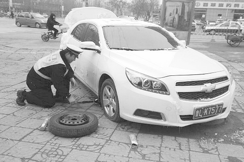2月8日11时许,衡水交警一大队四中队陈伟等协勤员正在中心街与胜利路路口维持交通秩序,这时一辆白色轿车在停车线前停下等信号灯。陈伟发现这辆车的右前胎是瘪的,而司机好像还不知道。陈伟立即上前告诉司机,并帮助司机更换轮胎。