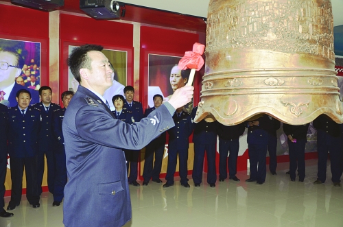 为推进党的群众路线教育实践活动开展,2月19日下午,承德市双滦区公安分局组织机关30名党员干部前往市廉政教育基地接受廉政教育。民警们观看了近年来全国、全省查办的一批大要案件和部分典型人物腐败案例。在教育基地,每名民警都签订了廉政建设承诺书,重温了入党誓词。图为双滦公安分局政委贾成松在廉政教育基地敲响警示钟,警示党员干部筑牢反腐自律防线。 杨贵学 摄