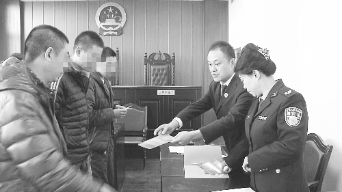 秦皇岛市山海关检察院、法院、公安分局、司法局于今年初联合成立了统一的社区矫正队伍。他们在接收社区矫正人员时都要举行一个正规的宣告仪式,同时各司其职,进行首次接受、教育、监督训诫,发放和学习《社区矫正法律监督联系卡》、《社区矫正法律监督宣传册》。图为近日在山海关区人民法院审判庭内进行的社区矫正接矫宣告仪式。