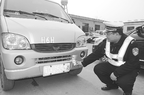 2月26日,邯郸市交警五大队民警在315省道(成峰路)执行治理酒驾、渉牌渉证违法行为任务时,发现一辆面包车的号牌部分不反光,遂示意车辆靠边停下。经过观察,这辆面包车车牌的第一位和第三位数字原本是数字2和6,通过粘贴魔术贴,变成了字母H和数字5。在车牌的其他数字上,民警也看到了曾经粘贴魔术贴变造号牌留下的痕迹。民警依法对该车予以扣留,并对驾驶人处以罚款、并记12分的处罚。图为民警揭穿变造号牌的手法。