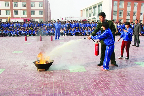 日前,平乡县第一中学举行火灾逃生演练活动。消防官兵首先向师生们讲解了消防器材的使用方法,并发放消防知识手册,让他们了解消防知识。演练中,从警报响起到学生全部从教室撤离到校园安全区域,仅用41秒,过程快速、安全、有序。图为消防官兵教学生使用消防器材。平政文 摄