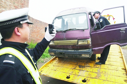 围绕沧州市中心城区“环境提升年”活动,沧州市公安交警二大队结合辖区实际情况,在集中治理交通秩序的同时,针对一些无牌无证、报废车辆等长期违法停放在路口两侧角落及长期停放用于存放货物的“僵尸车”进行统一专项整治。图为近日该大队值勤民警在沧州市长芦大道路段内非机动车道路旁的角落处,发现一辆报废并长期违法停放的面包车,在对其实行拖拽前,民警当场摄录车辆资料。 孙明山 摄