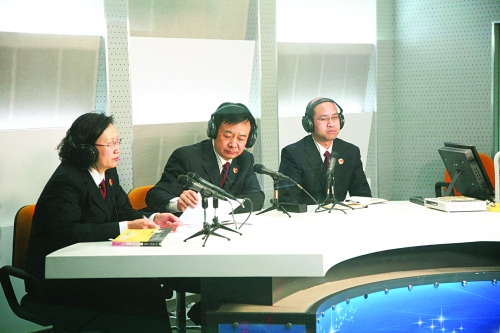近日,省检察院党组成员、副检察长周庆平(右二)带领省检察院公诉一处、反贪局综合处、民事行政检察处、控告申诉检察处等业务部门负责人,走进河北人民广播电台“阳光热线”直播间,通过电波与广大群众直接对话,并当场解答群众提的涉检法律问题。 李书品 摄