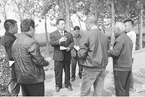 邯郸县检察院党组一班人不失时机地带员深入到田间地头,积极开展涉农检察工作宣传月活动。图为邯郸县检察院党组书记、检察长李清林与驻村检察工作队成员一起,在辖区代召乡裴堡东村解答群众事关“三农”的法律政策咨询。