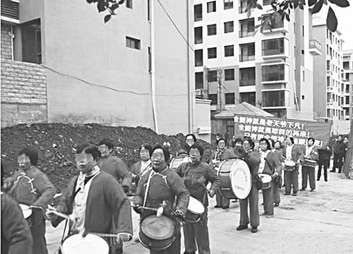 敲锣打鼓为“全能神”“叫卖”的中老年妇女
