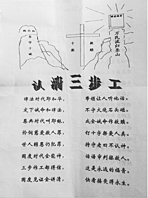 这是“全能神”所谓“三步工”的反动宣传单。一旦见到这种类似的东西,切记提高警惕,以防引火上身。