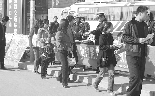 为给广大群众提供畅通有序的交通环境,日前,高碑店市交警大队在汽车站前设立宣传台,摆放宣传展板,加强出行引导和安全提示工作。图为民警向群众发放宣传材料。