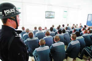 右图:服刑人员在监狱多功能厅观看假释案件庭审实况直播。