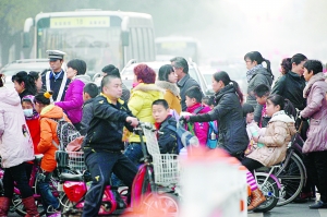 在育红小学门口执勤的交警也颇感压力。参与过在这里执勤的交警曾对记者说,解决堵车问题,关键是解决孩子过马路问题。育红小学地处交通主干道路的邢台市冶金北路,除寒暑假外的多数时间,学生上下学时学校门口经常发生交通拥堵。小学生上下学多数家长都来接送。育红小学有2000多学生,接送他们上学的又多是机动车。为了维持秩序,邢台市交警二大队不得不在上学时间安排4名民警到学校门前值勤,一天4次,每天值勤累计5小时以上。民警稍有疏忽,交通就变得混乱不堪。而民警值勤只能缓解拥堵,或者说是给通过的车辆和行人一种安全感,汽车可以看民警手势不急于抢行,不用担心撞到横过马路的学生,学生过马路由民警带领通过,家长不必担心安全问题。路边停放的机动车、自行车,一直是交通混乱的顽疾,不是这些车不按规定车位停放,而是有些车根本找不到停放位置,民警提出了诸如停车位、机动车出口、隔离护栏等交通秩序硬件整改方案也一直没有彻底落实。
