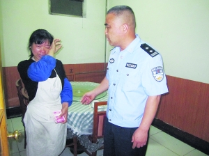 图为武力军给犯罪嫌疑人许某的家属刘某送去1万元捐款,刘某从民警手中接过捐款时,流下了激动的泪水。