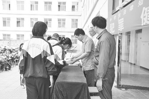 为增强学生法治观念,促进和谐平安校园建设,5月16日上午,赵县人民检察院未成年人刑事检察科干警为赵县李春学校送去50册由石家庄市检察院编印的《中学生刑事法律普及手册》,并为该校1000余名师生进行了一场题为“远离犯罪·健康成长”的法治报告宣讲。图为干警向学生们发放《中学生刑事法律普及手册》。黄若磊 摄