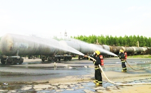 图为消防队员用水枪对罐体进行降温。