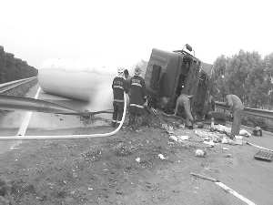 本报讯 (记者 刘彬)5月21日15时许,津保高速公路860公里处,一辆18吨天然气槽车与一辆大型货车发生侧翻,幸无人员被困。容城消防中队接到报警后迅速到场,与当地应急办、公安、安监、环保、燃气、路政、高速交警、气象等部门协同配合,经过15个小时的救援工作,成功排除险情。