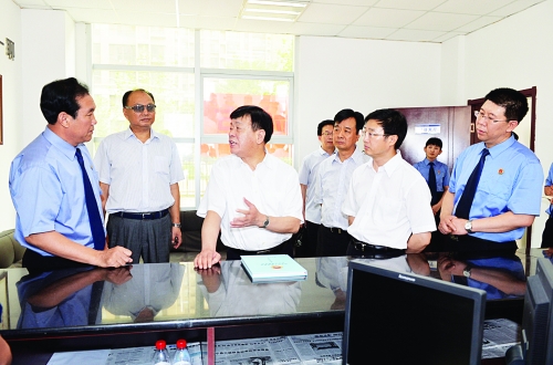 近年来,石家庄市桥东区检察院高度重视控告申诉检察工作,在刑事申诉案件、刑事被害人救助、文明接待室建设、群众信访案件处理等多个方面都取得了突出成绩。日前,最高人民检察院党组成员、副检察长柯汉民到我省指导“举报宣传周”活动并调研控申检察工作期间,深入到石家庄市桥东区检察院,对该院控告申诉检察工作予以充分肯定。图为柯汉民(左三)在省检察院党组书记、检察长童建明陪同下,在石家庄市桥东区检察院听取该院党组书记、检察长张合乡控申工作汇报。省检察院党组成员、副检察长周庆平,省检察院党组成员、石家庄市检察院检察长侯建华参加调研。