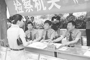 活动现场,干警为群众发放《举报宣传材料》、《法律知识趣味读本》等宣传读本,现场接受群众举报、投诉,为群众解答难点问题。该市检察机关精心制作的预防职务犯罪宣传展牌吸引群众驻足观看。图为李永志检察长(右一)现场接受群众咨询、投诉。