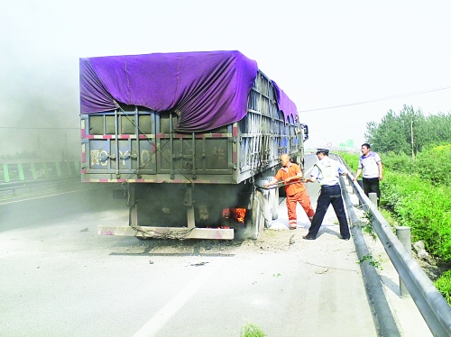 石家庄高速交警巡逻时发现半挂车右后轮发生自燃