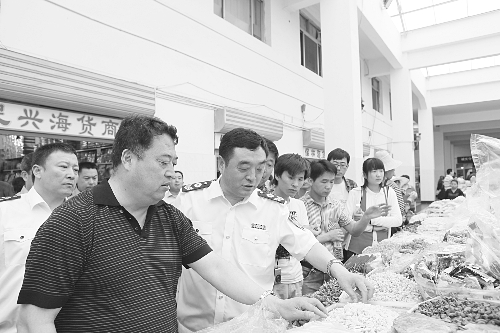 为做好暑期食品安全保障工作,为游客、市民创造更加安全的食品消费环境,秦皇岛市开展了暑期食品安全大检查,突出暑期旅游景区周边、城乡接合部、农家乐旅游等重点区域,农产品生产基地、食品生产经营企业、集贸市场、宾疗招等重点企业,深入开展风险排查和隐患治理工作。图为近日秦皇岛市食安办主任、市食药监局局长纪振勇检查北戴河石塘路市场。