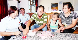 上图:田小朴的父亲清点法官送来的6万元执行款后,准备摁手印。