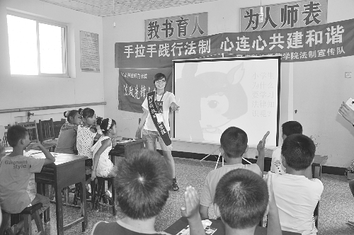 7月11日,河北科技师范学院文法学院法政先锋实践小分队来到卢龙县刘田各庄镇,开展为期三天的“手拉手践行法治 心连心共建和谐”系列活动。队员们为柳河北山希望小学的学生送去了学习用品,并以授课方式和游戏形式,培养孩子们的法律意识。图为队员们在课堂上与学生互动。