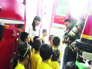 在富强大街消防中队,这群娃娃终于零距离与消防官兵接触,孩子们很激动,刚一下车就被眼前的“庞然大物”深深吸引。焦急等待了10分钟后,孩子们终于在消防叔叔的带领解说下看了回“西洋镜”。