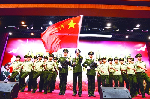 7月31日,秦皇岛边防支队的官兵与驻地群众举行文艺联欢会,迎接“八一”建军节。图为该支队的官兵在表演《军旗颂》。