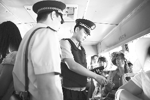 图②:公交车上,民警们在一丝不苟地执行任务,认真地核查身份信息。