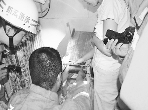 本报讯 (记者 薛树旺)8月14日清晨,丰宁满族自治县县城有一人右手被卡在面条机里。承德消防丰宁中队接到报警后,迅速出动1部抢险救援车、7名指战员赶赴现场。在现场,消防人员发现有一人右手手指被面条机的两根大转轴死死“咬住”,不能动弹,并有鲜血流出,被困人员情绪很不稳定。指挥员在仔细观察面条机结构后,决定利用手动破拆工具组慢慢扩张卡手转轴下方的两个细轴腾出救援空间,经过救援官兵近20分钟的不懈努力,最终将被卡人员的手成功救出。图为救援现场。