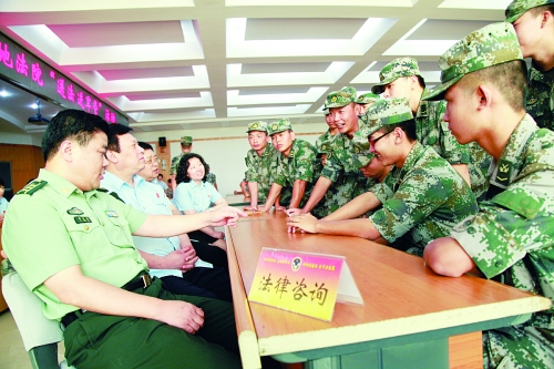 8月19日,省高级人民法院和河北军事法院22名军地法官,带着数套法律书籍来到38集团军某旅,联合开展“送法进军营”活动。此次活动针对基层部队实际和官兵法律需求,突出集中宣讲与针对性教育疏导相结合、提供咨询帮助与解决涉法问题纠纷相结合、开展涉军维权服务与专题调研相结合。图为军事法院和省高院的法官们在为官兵解答法律问题。