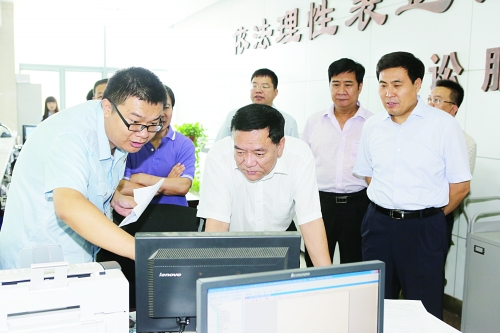 8月19日,唐山市委常委、政法委书记刘建国到唐山市中级人民法院就司法公开工作进行调研指导。今年以来,唐山市法院系统在司法公开工作中进行了深入探索,开展了裁判文书上网、庭审视频直播、庭审微博直播等工作,取得了初步成效。刘建国仔细观摩了司法公开平台运行和使用情况。他要求唐山市法院系统要进一步做好司法公开,全面提升工作水平。图为刘建国(中)在唐山市中级人民法院院长李彦明等领导的陪同下检查指导工作。