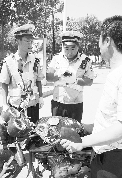 沧州市公安交警二大队在交通秩序整治专项行动中,组织警力强化路面管控,严查机动车各类交通违法行为。图为8月14日,一名摩托车驾驶人不戴安全头盔,并未随身携带驾驶证、行驶证,受到执勤民警的处罚。